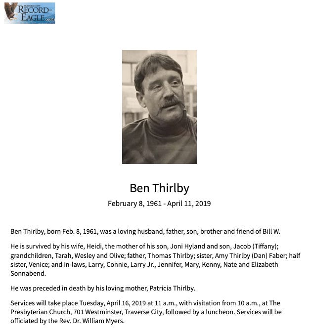 Ben ThirlbyApril 11, 2018Oct 21, 2024ShareClick here to read the complete obituary.Thanks for reading Traverse City Class of 1979 Memorial! This post is public so feel free to share it.SharePreviousNext