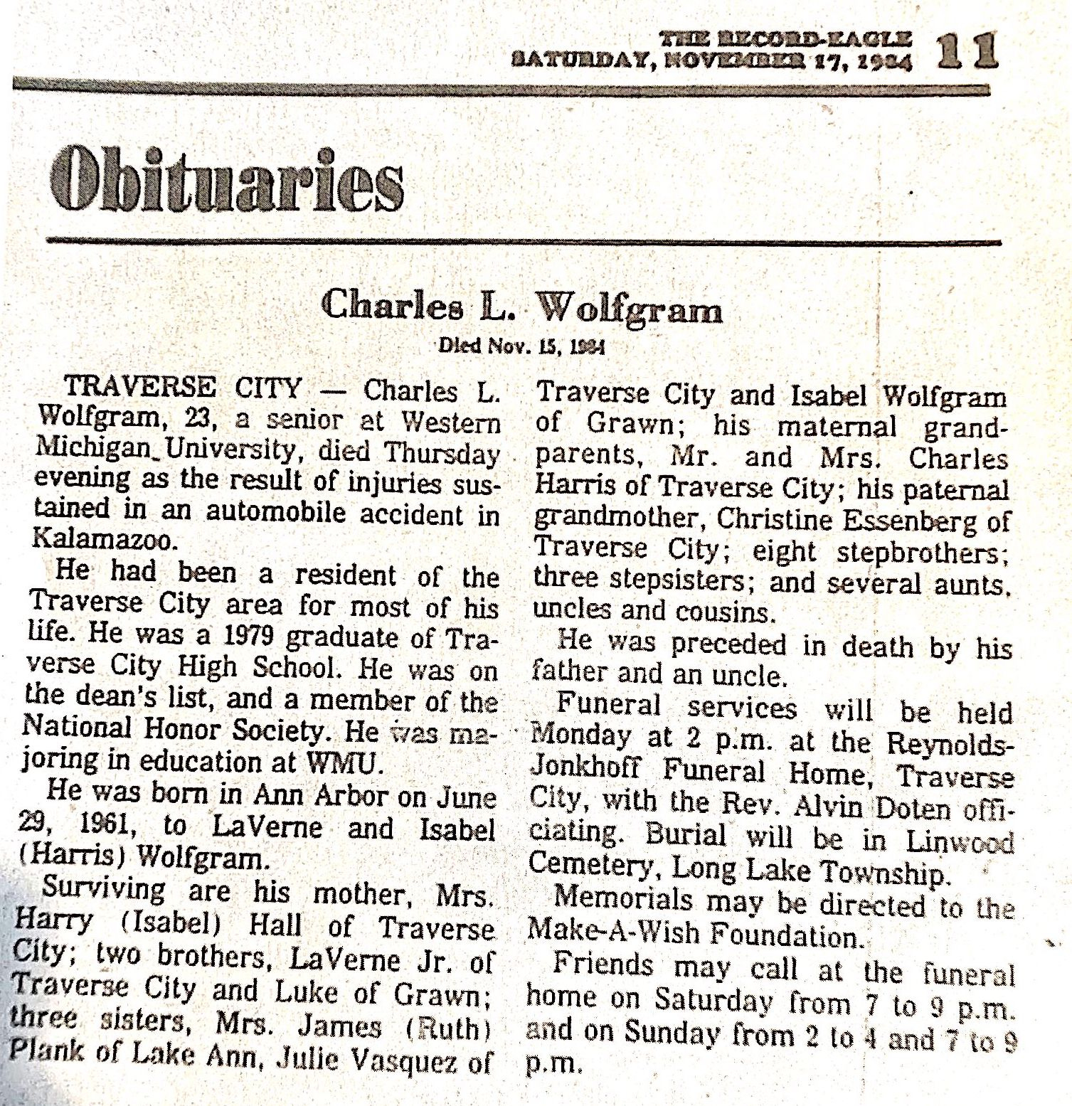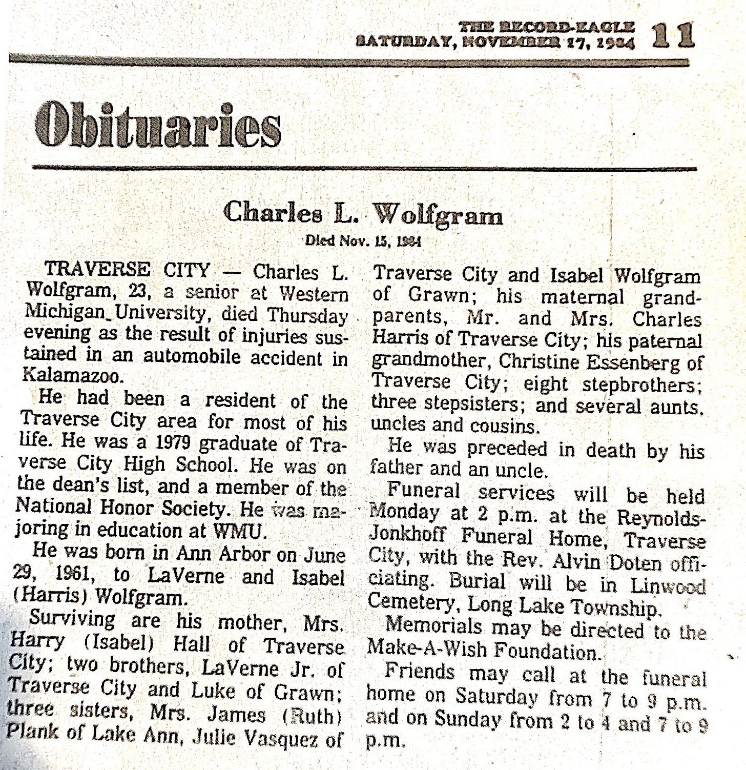 Charles WolfgramNov. 15, 1984Oct 17, 2024ShareThanks for reading Traverse City Class of 1979 Memorial! This post is public so feel free to share it.SharePreviousNext