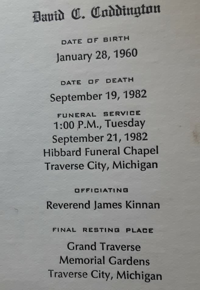 David CoddingtonSept. 19, 1982Oct 17, 20241ShareDavid was a longtime classmate who left Traverse City before our senior year.Thanks for reading Traverse City Class of 1979 Memorial! This post is public so feel free to share it.SharePreviousNext