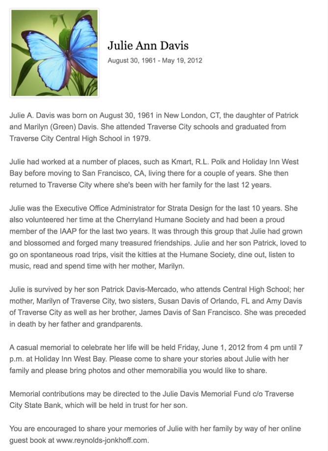 Julie DavisMay 19, 2012Oct 21, 2024ShareThanks for reading Traverse City Class of 1979 Memorial! This post is public so feel free to share it.SharePreviousNext