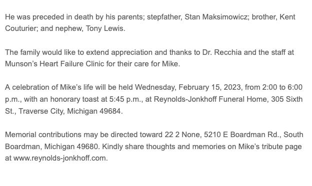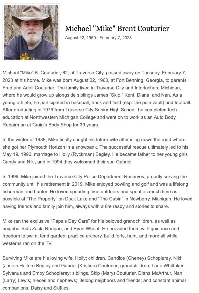 Michael CouturierFeb. 7, 2023Oct 22, 2024ShareClick here to read the complete obituary.Thanks for reading Traverse City Class of 1979 Memorial! This post is public so feel free to share it.SharePreviousNext