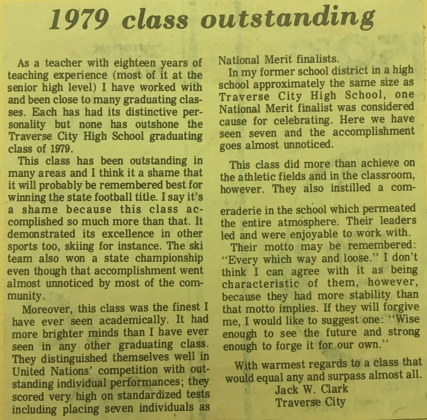 For our graduating class of 1979, the feeling was apparently mutual. He even wrote a letter to the editor of the local newspaper, calling our class “the finest I have ever seen academically. It had more brighter minds than I have ever seen in any other graduating class.”