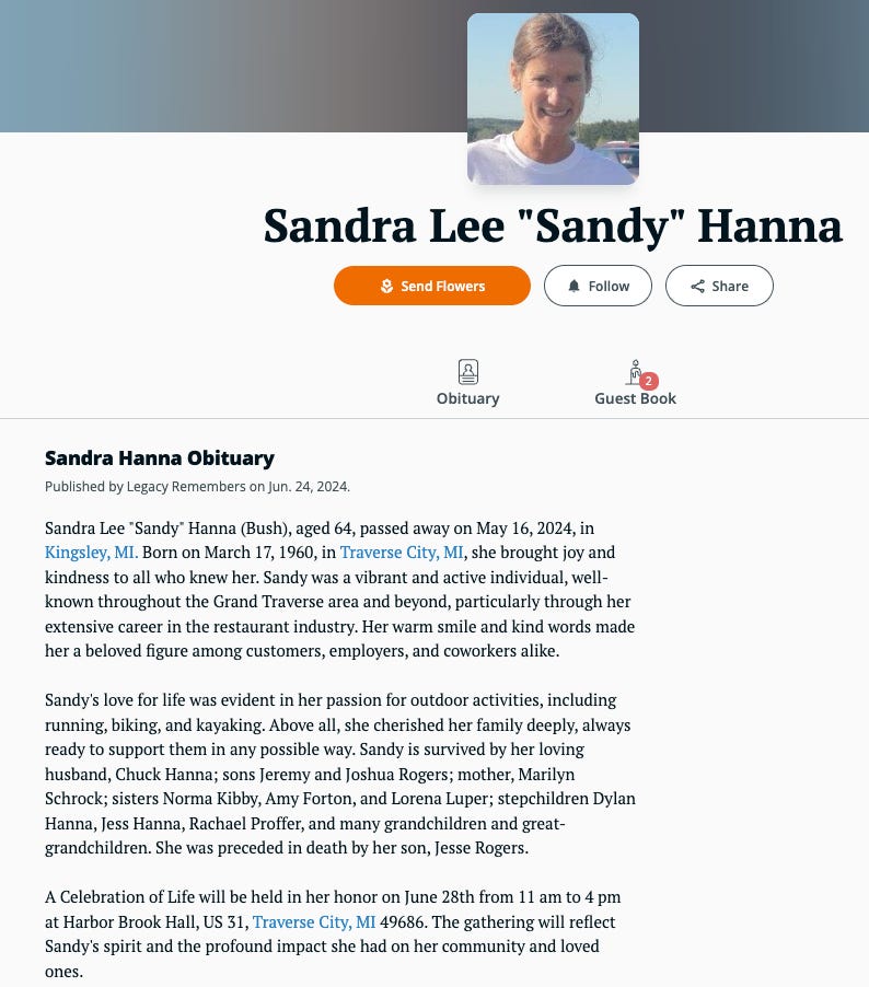 Sandra BushMay 16, 2024Oct 23, 202411ShareSandra was a longtime classmate who left our school before graduating.Thanks for reading Traverse City Class of 1979 Memorial! Subscribe for free to receive new posts.SubscribeClick here to read the complete obituary.Thanks for reading Traverse City Class of 1979 Memorial! This post is public so feel free to share it.SharePreviousNext